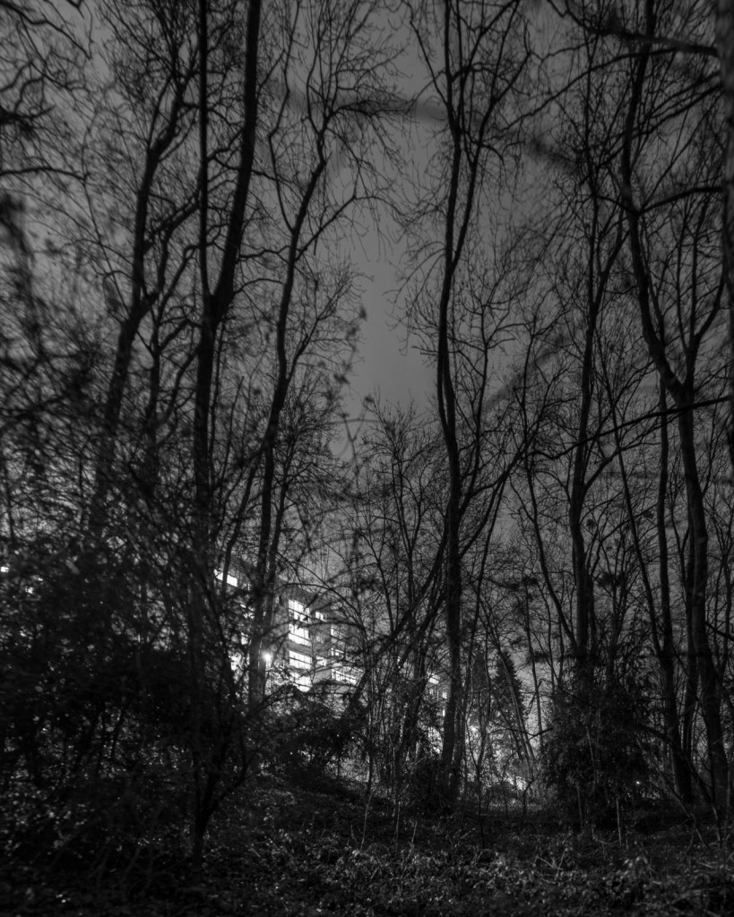 À Evry,à la nuit tombée, des logements en lisière de forêt. In Evry, at nightfall, housing at the edge of a forest. #edge #lisière #evry #foret #nuit #logement #housing #paysage #landscape #forest