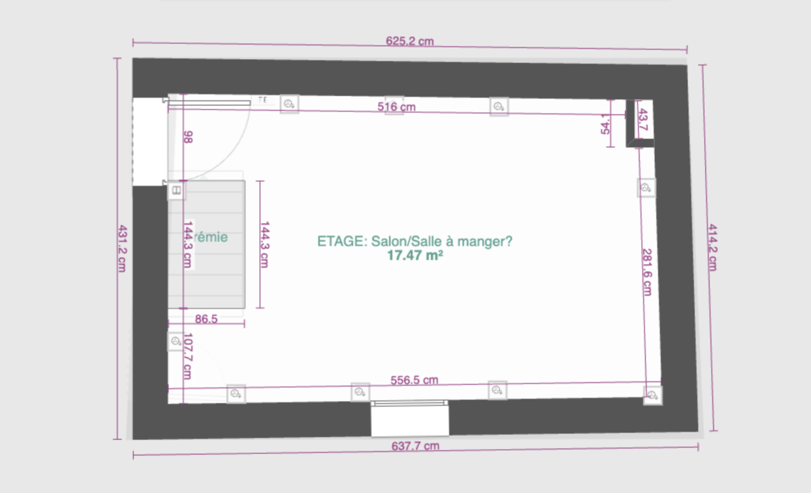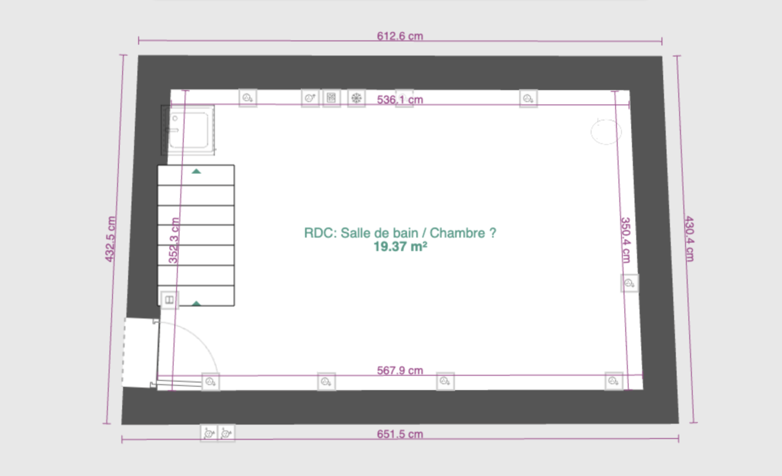 Attention, les mesures intérieurs ci dessous sont imprécises (+/-3cm?) et les mesures extérieurs ont été extrapolées pour des murs de 50 cm, ce qui est sans doute sous évalué.