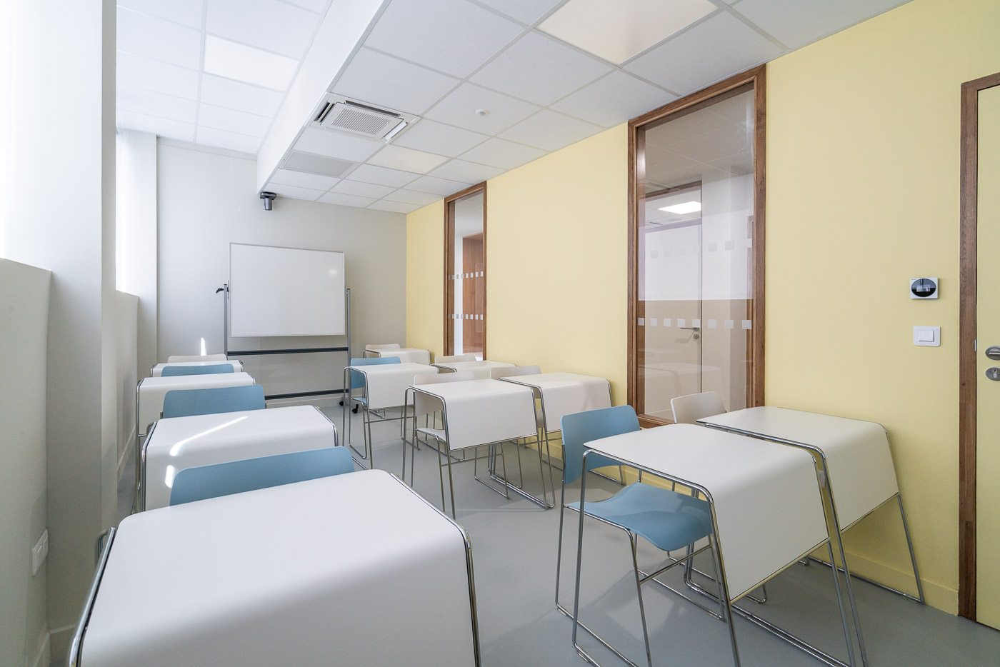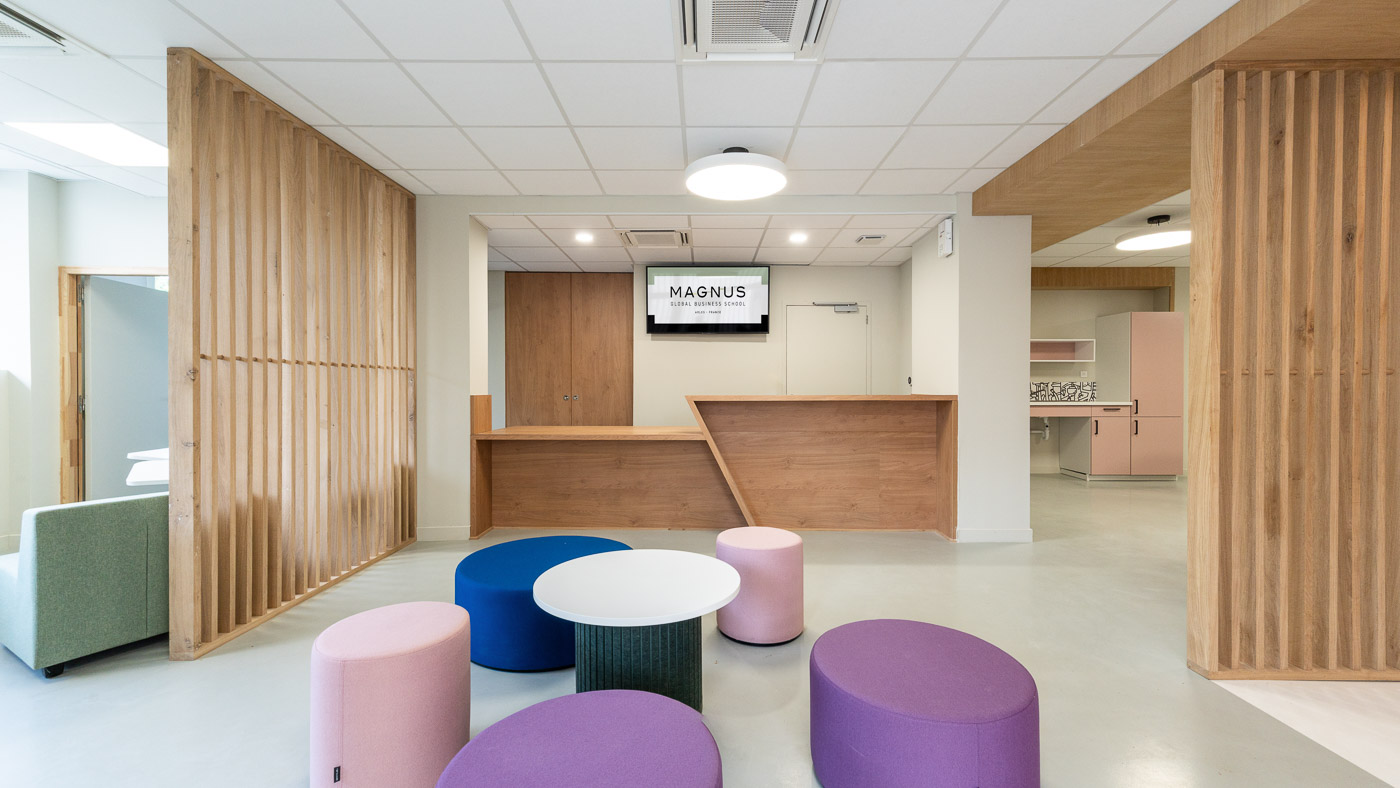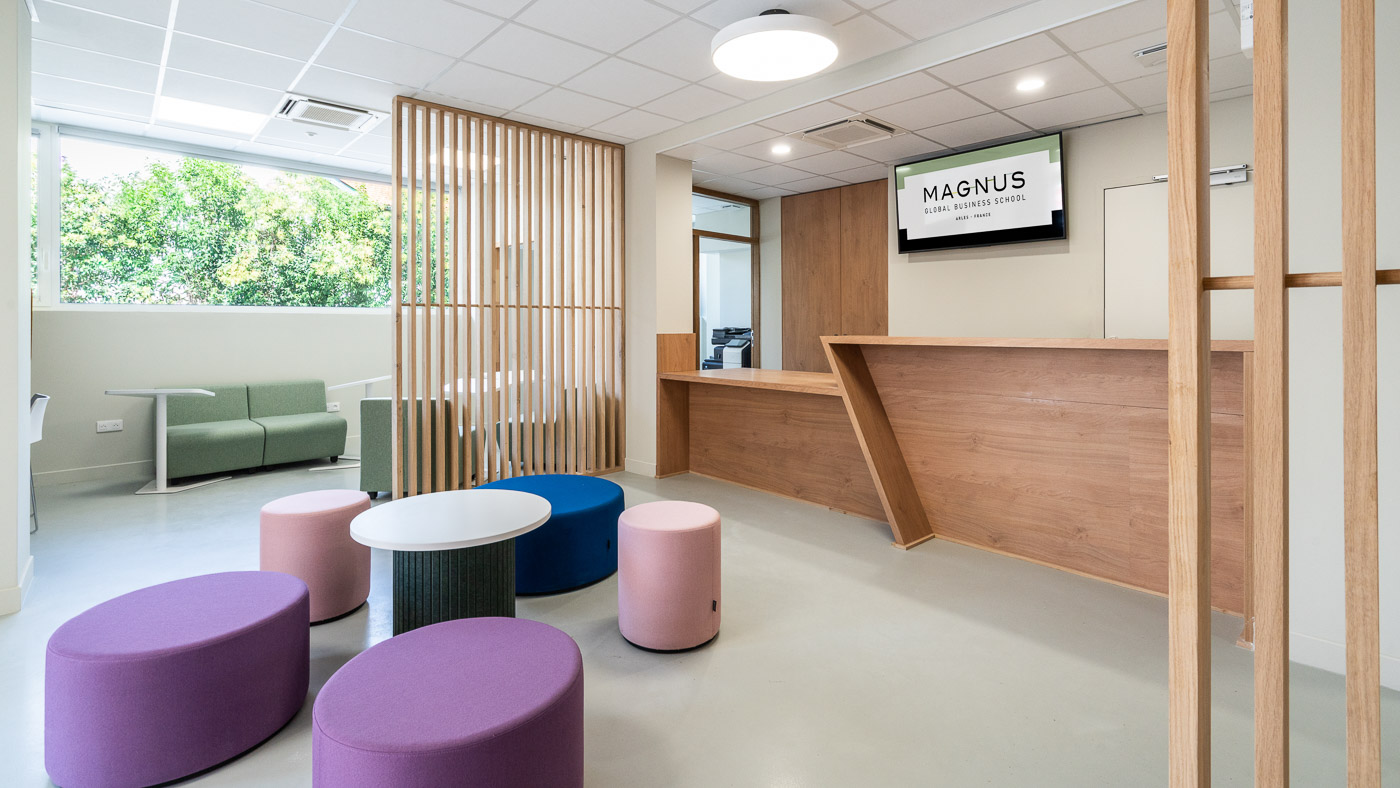 Création de l’École de Commerce Magnus Business School à Arles, aout 2025. Ce projet de 620m² réhabilite une structure des années 70 pour y loger un pôle accueil, des espaces administratifs et 8 salles de cours. Une synergie entre existant et fonctionnalité contemporaine pour la CCI PAYS D’ARLES.